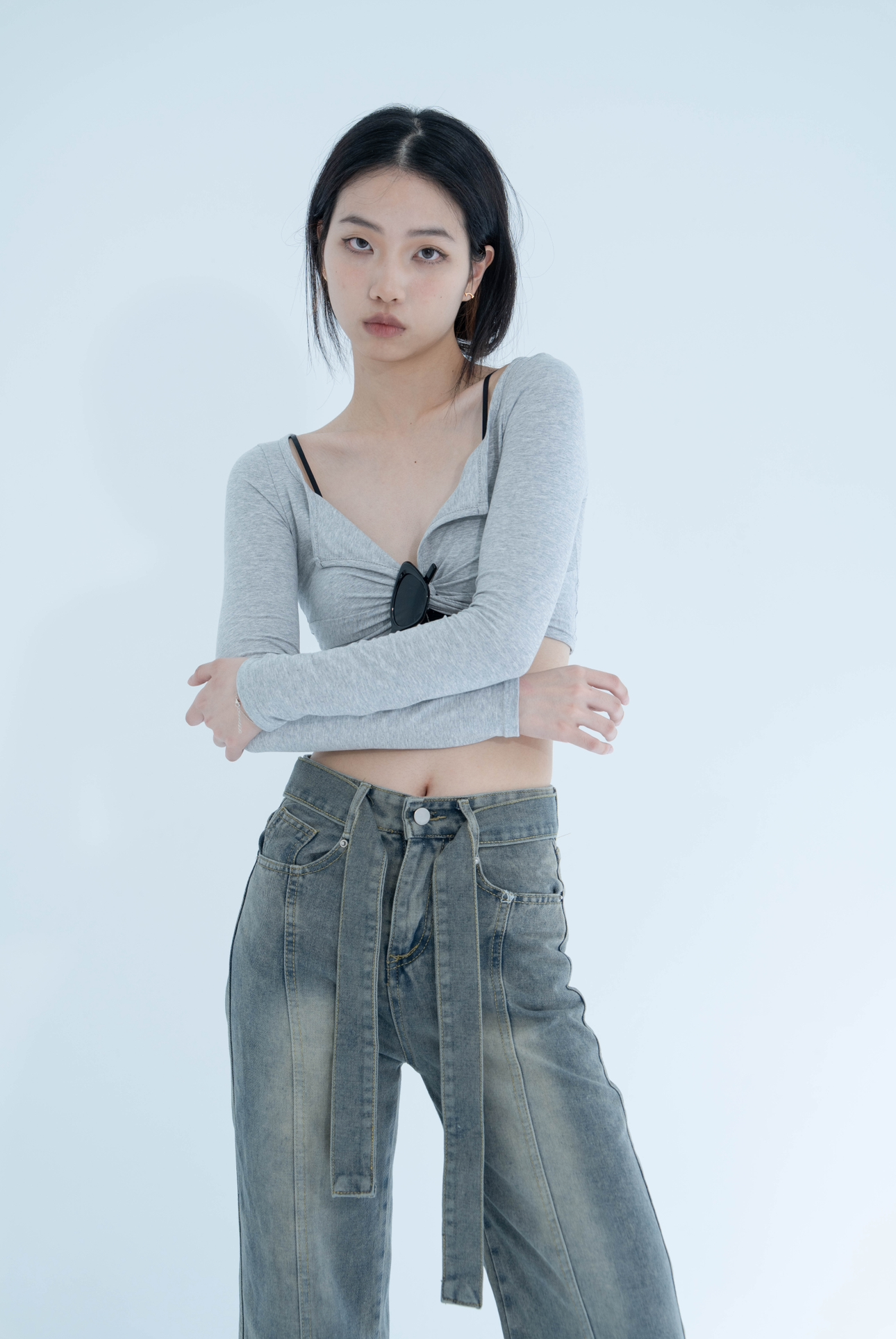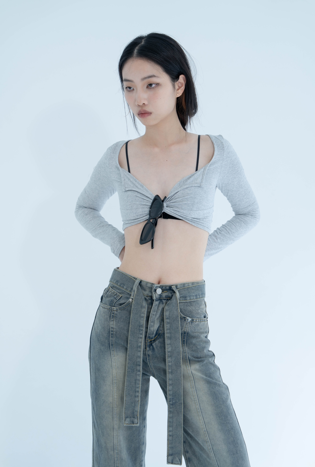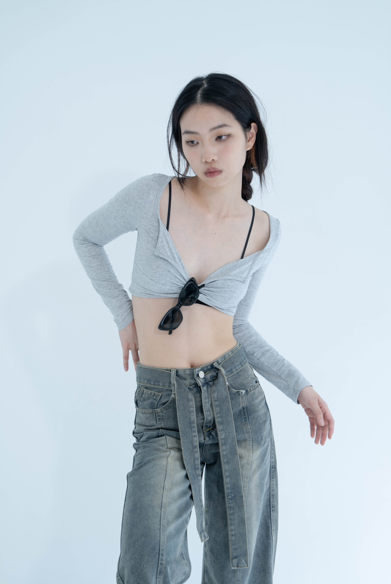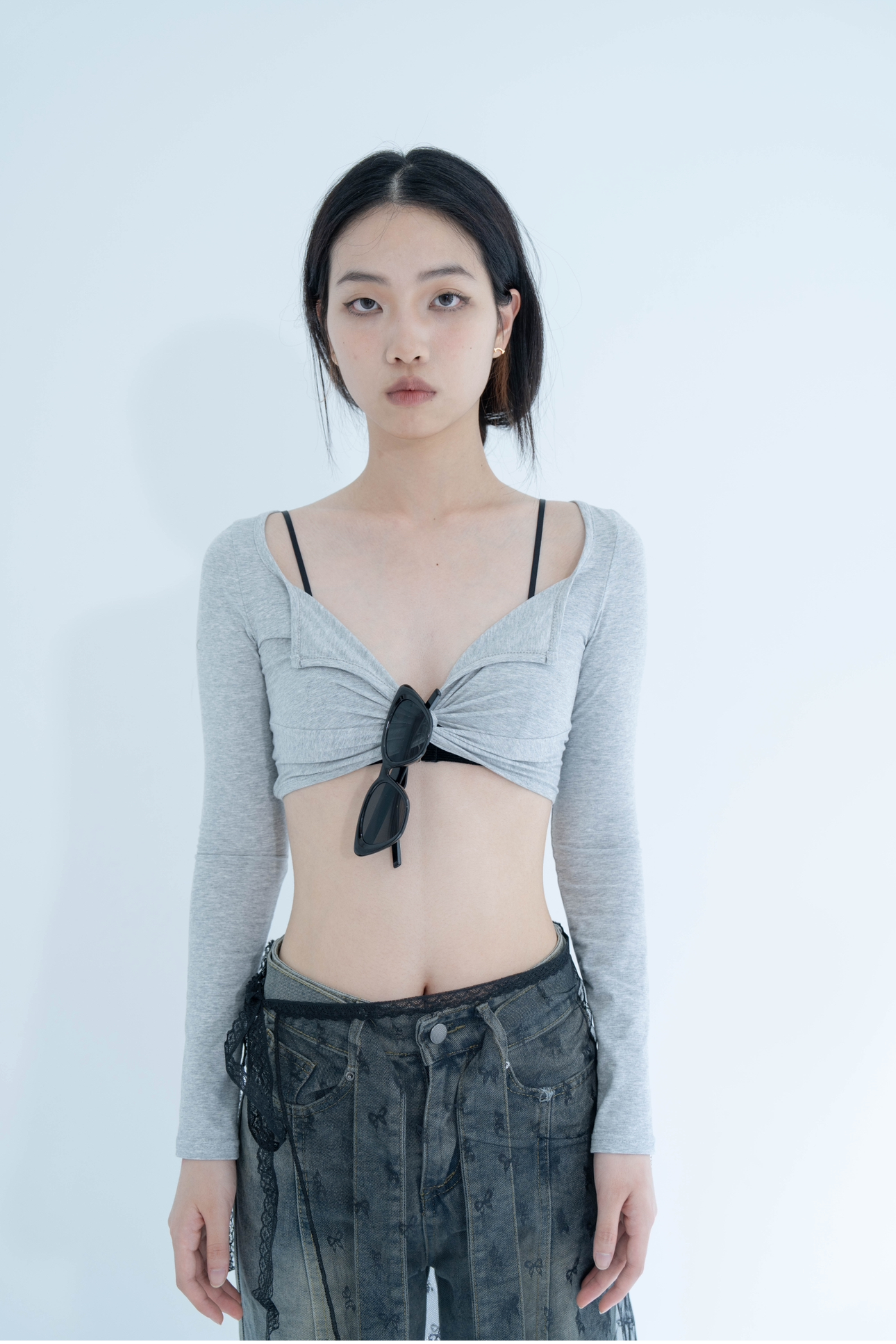 【jnauxz】灰色陷阱 辣妹V領扭結極短上衣