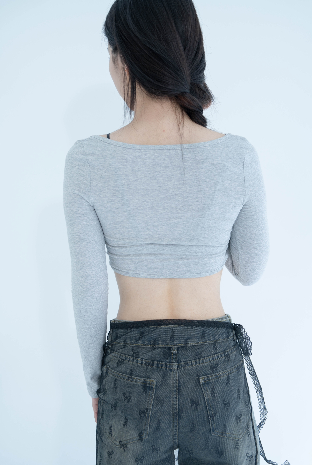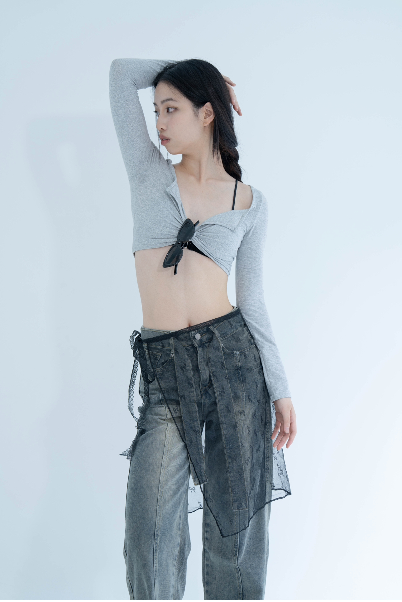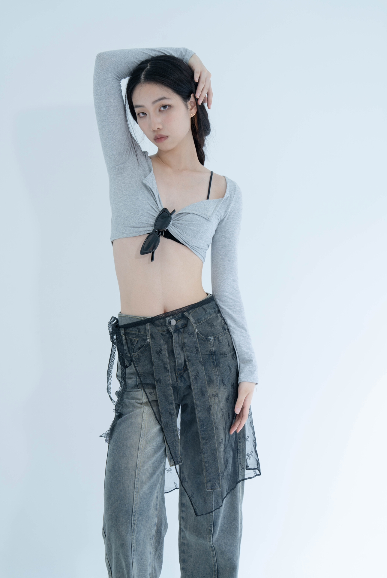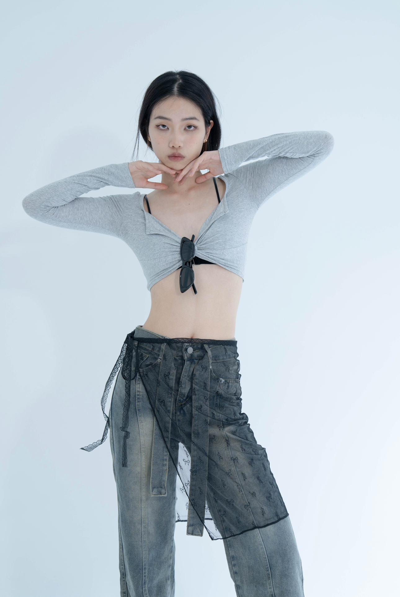 【jnauxz】灰色陷阱 辣妹V領扭結極短上衣