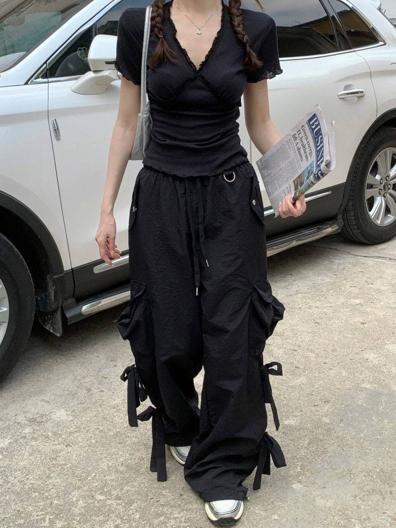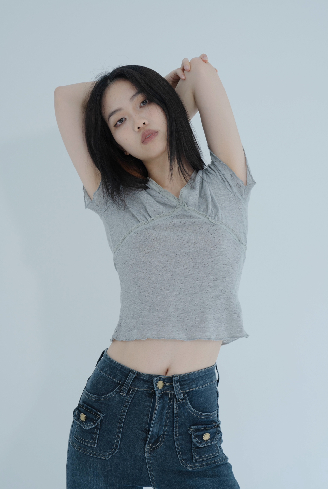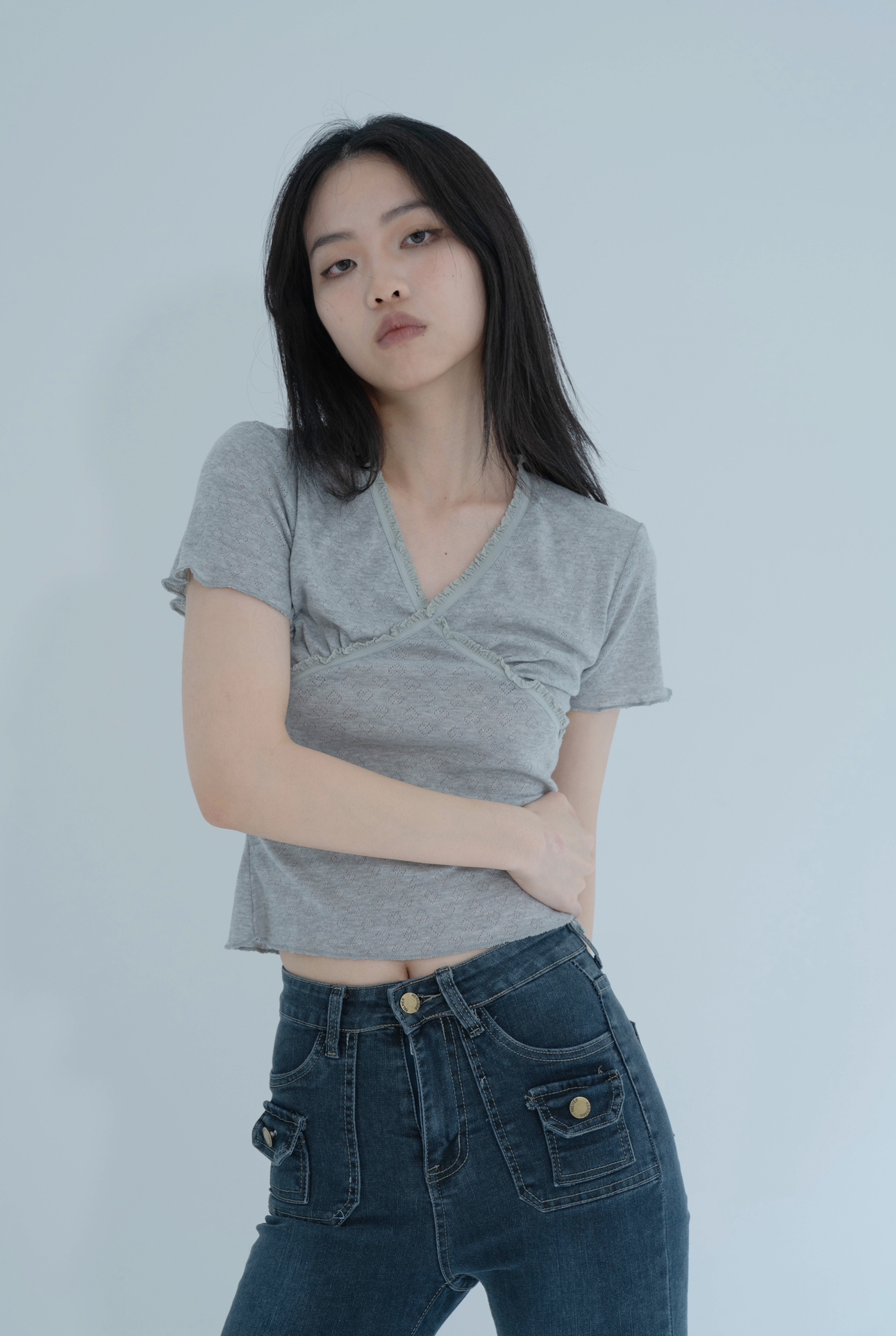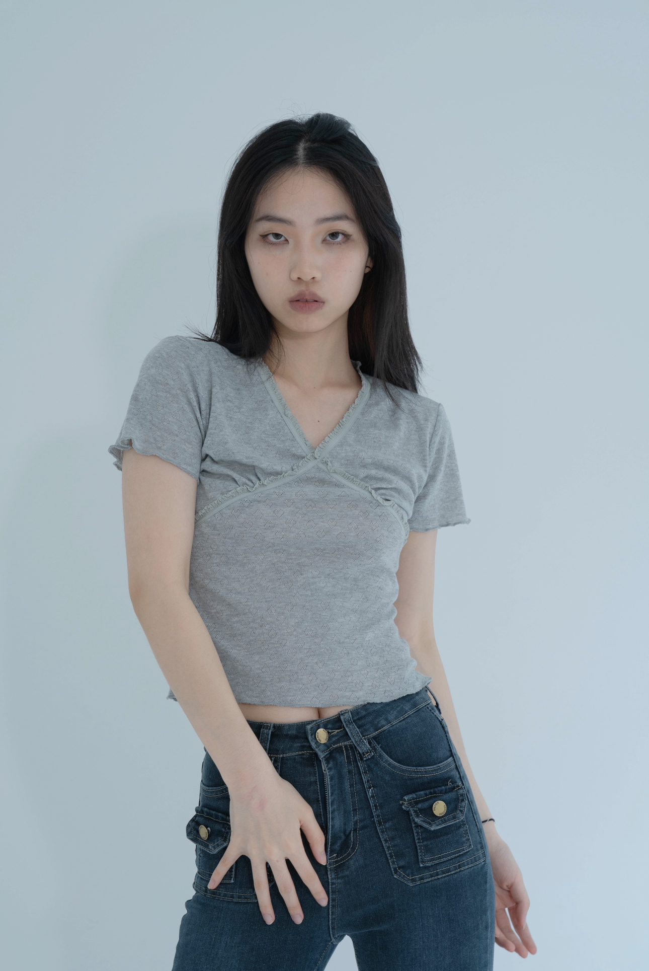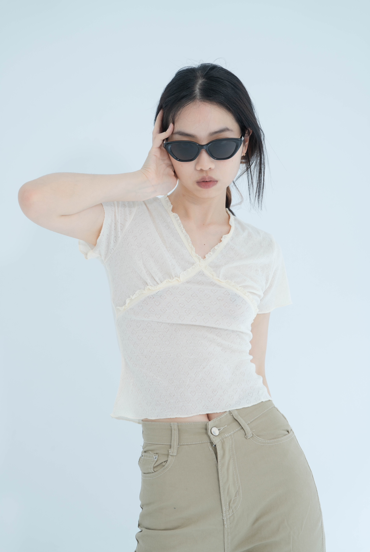 微微透膚的一款短上衣 交叉蕾絲花邊很顯身材~~