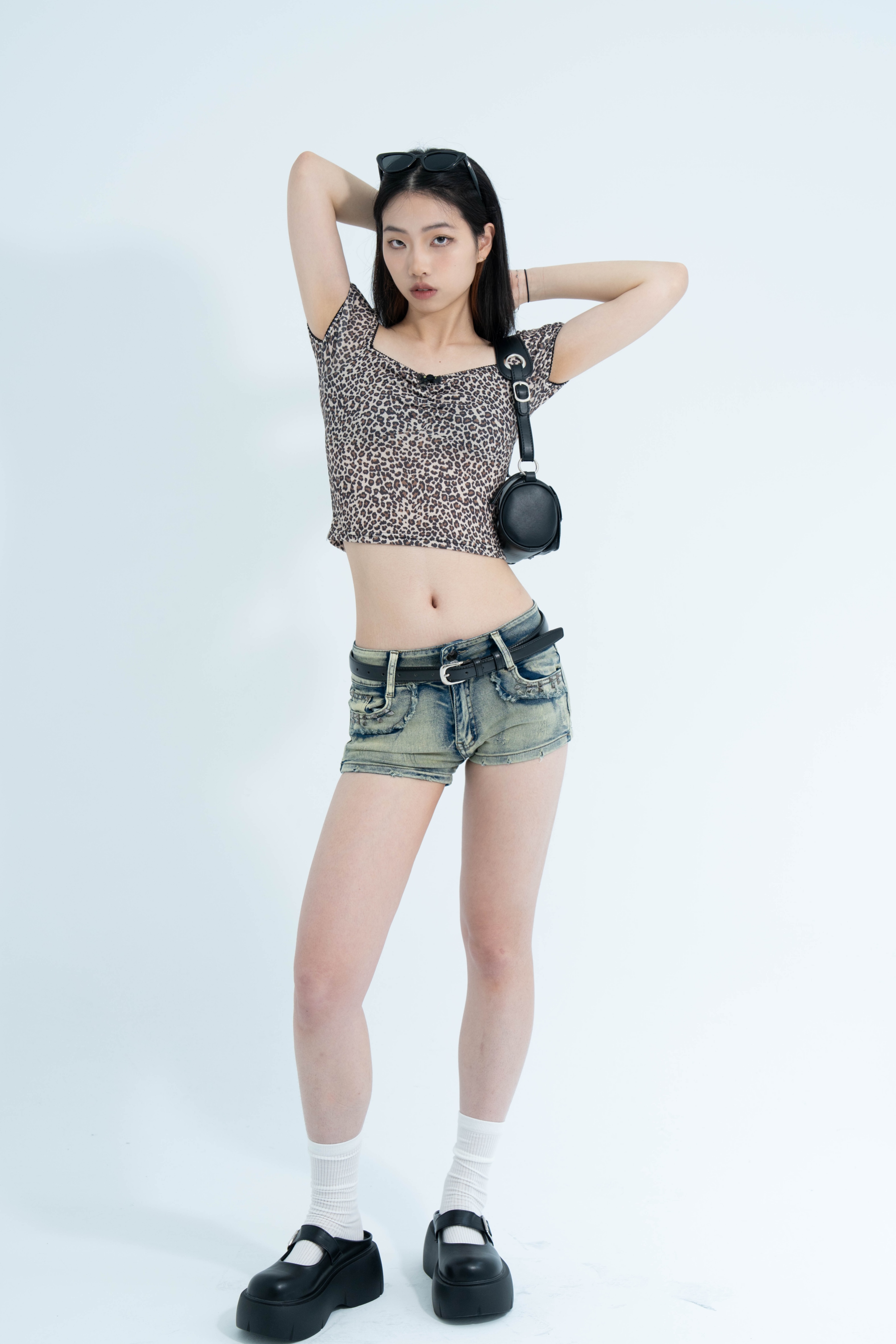 【jnauxz】甜辣性感 豹紋方領顯瘦上衣 (可拉一字肩)