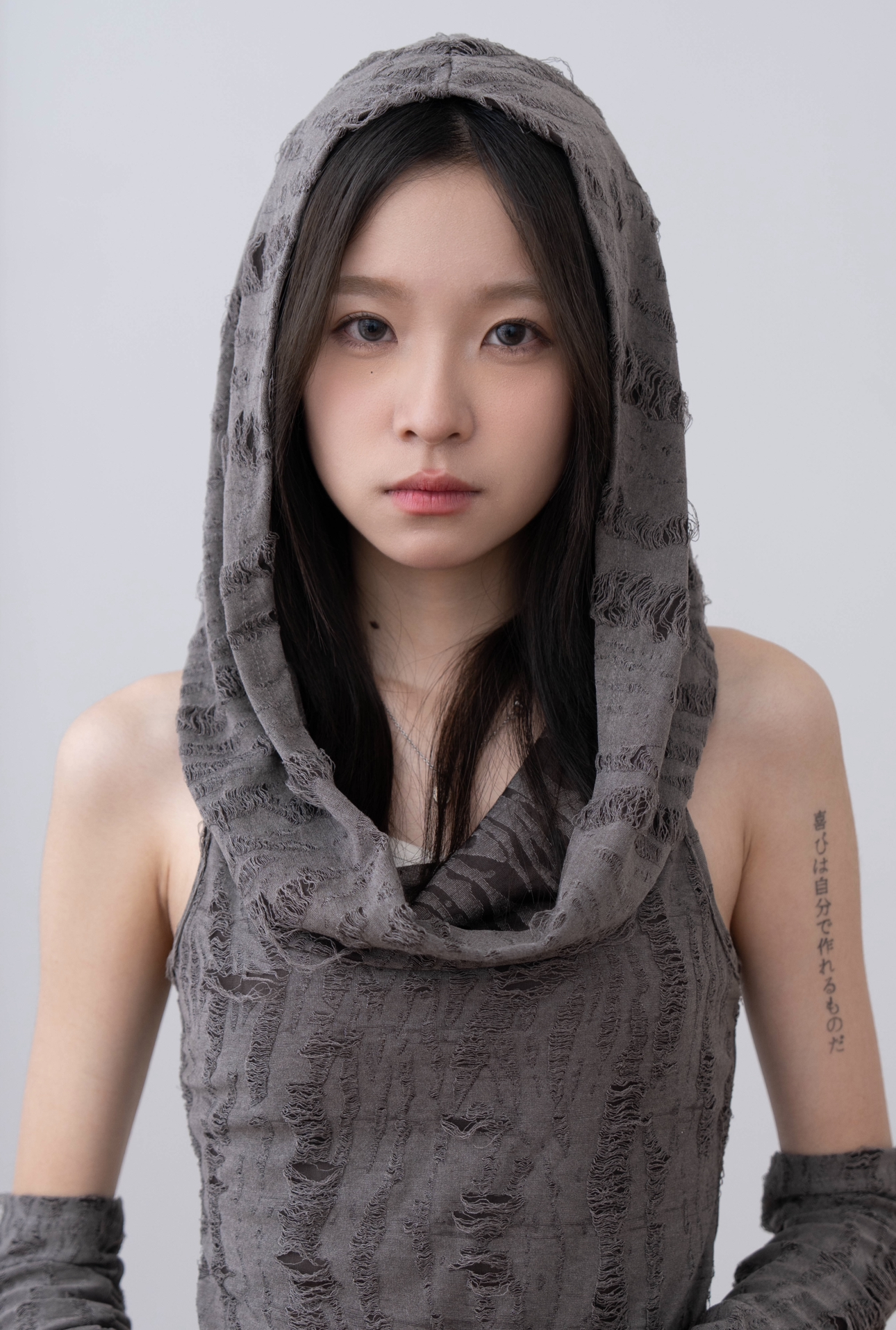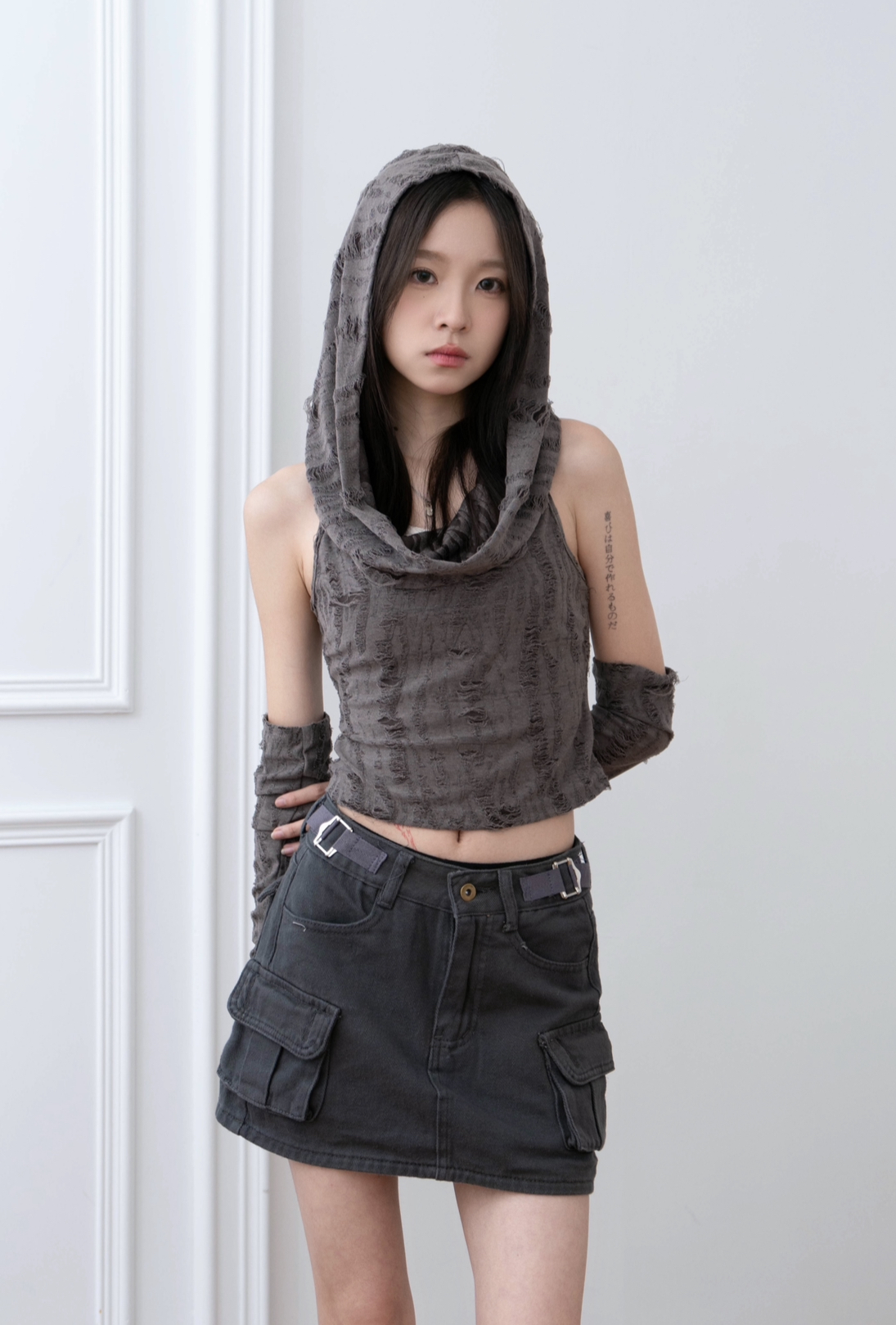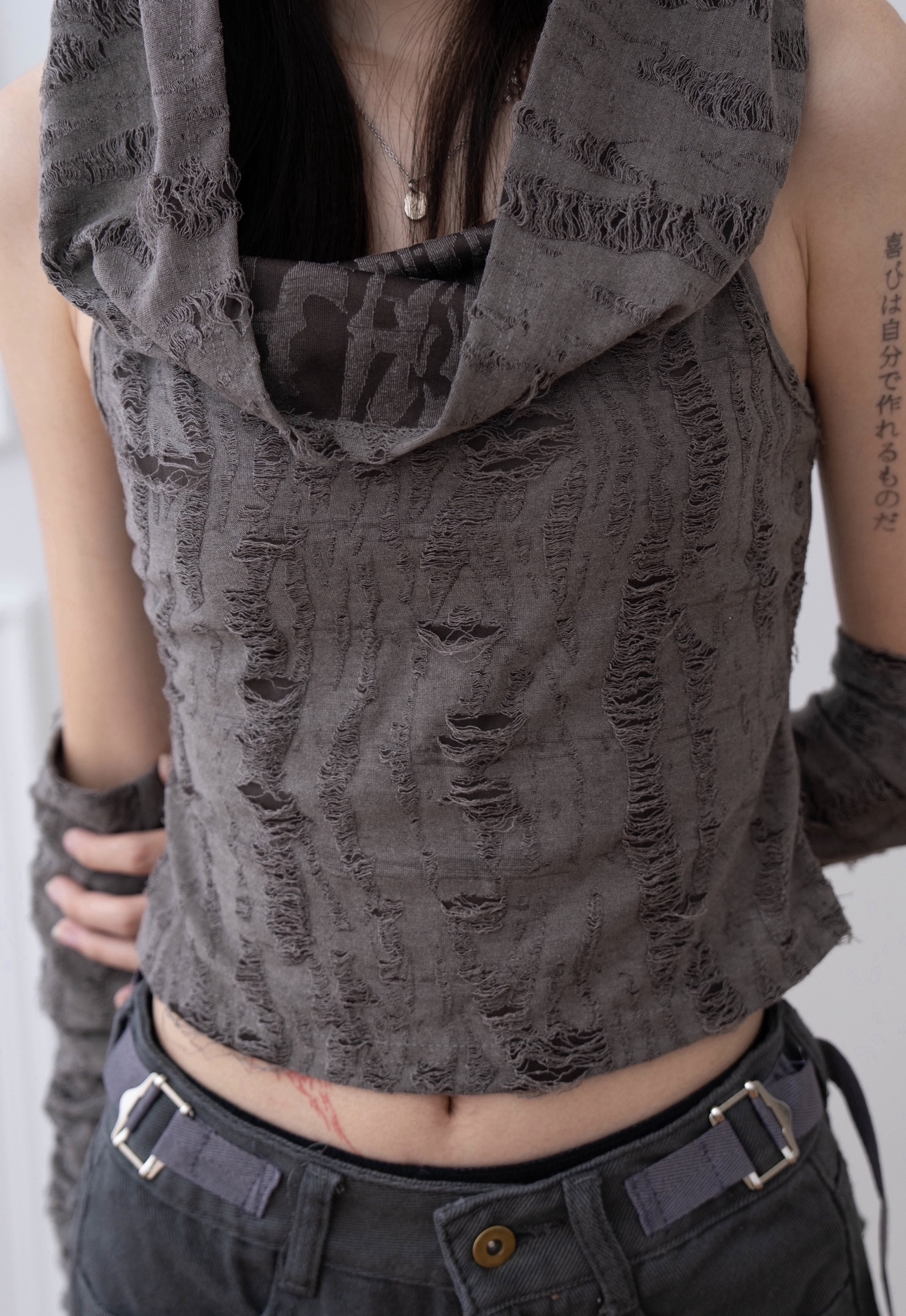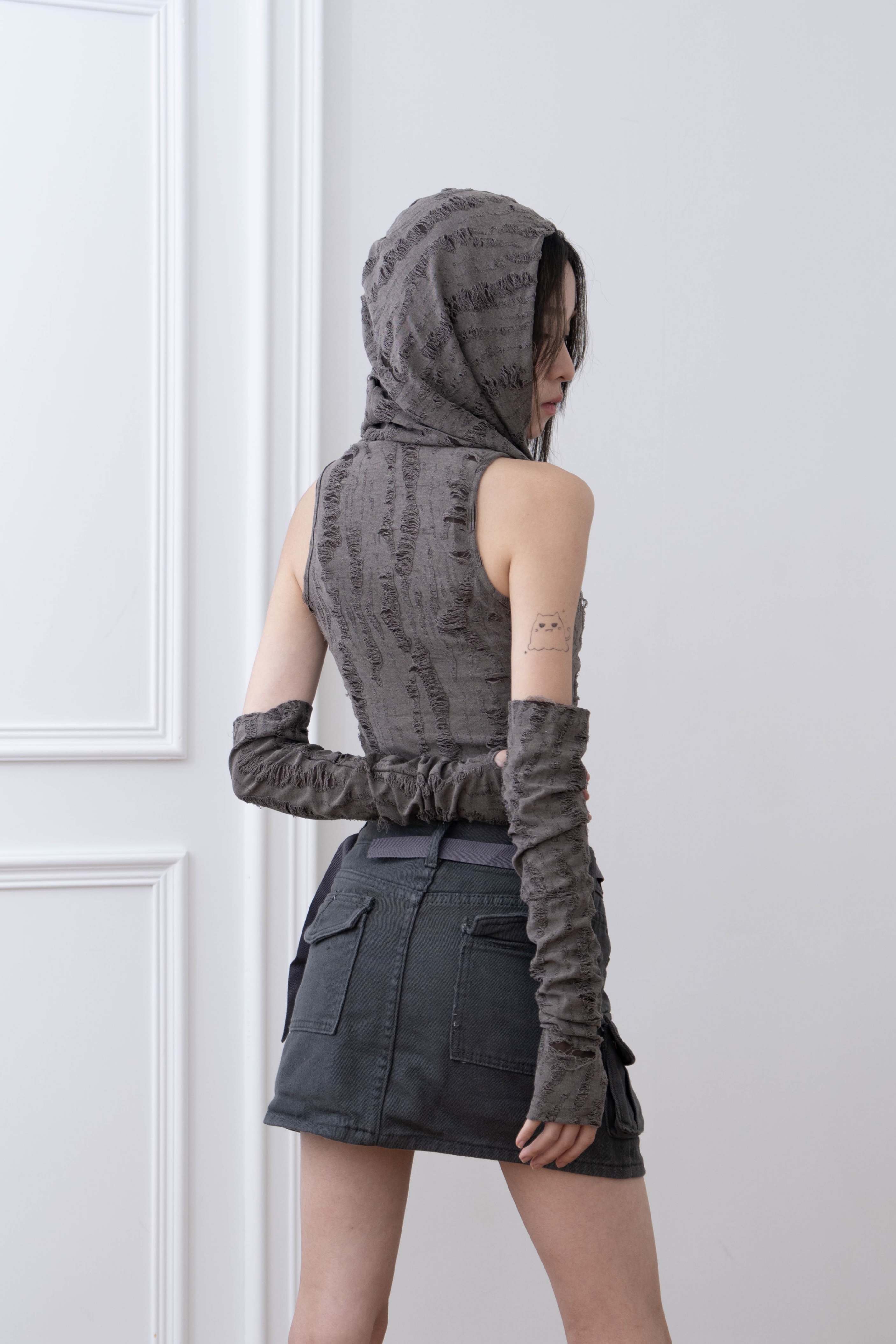 超特別的一款~! 很有設計感 做舊刷破的設計 但都有內裡所以不會走光 上衣是連帽背心+袖套的設計